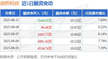 本站消息,8月11日,剑桥科技(603083)融资买入1.73亿元,融资偿还2.09亿元,融资净卖出3544.05万元,融资余额10.51亿元,近20个交易日中有14个交易日出现融资净买入。